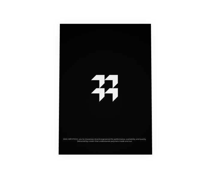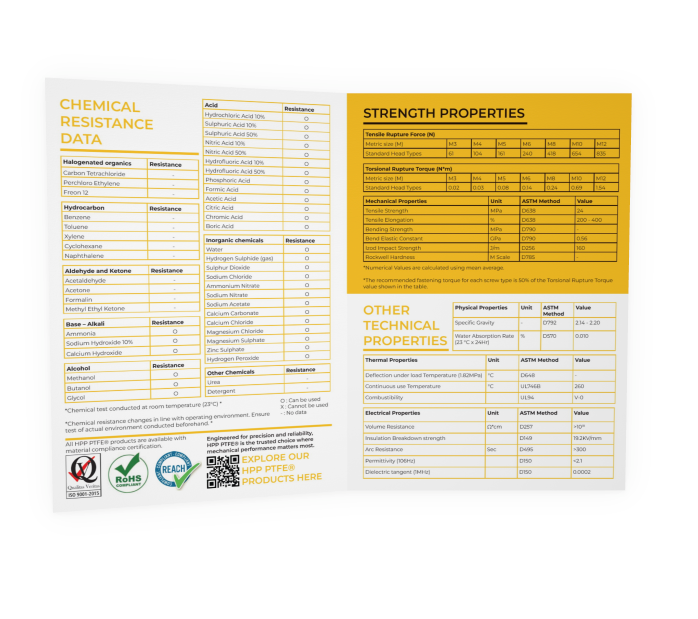 High-quality A4 datasheet that presents the key performance characteristics of PTFE in a clear, professional format. Printed on 250 gsm gloss paper for durability and a premium feel, it includes comprehensive technical data covering mechanical, thermal, electrical, and chemical properties.