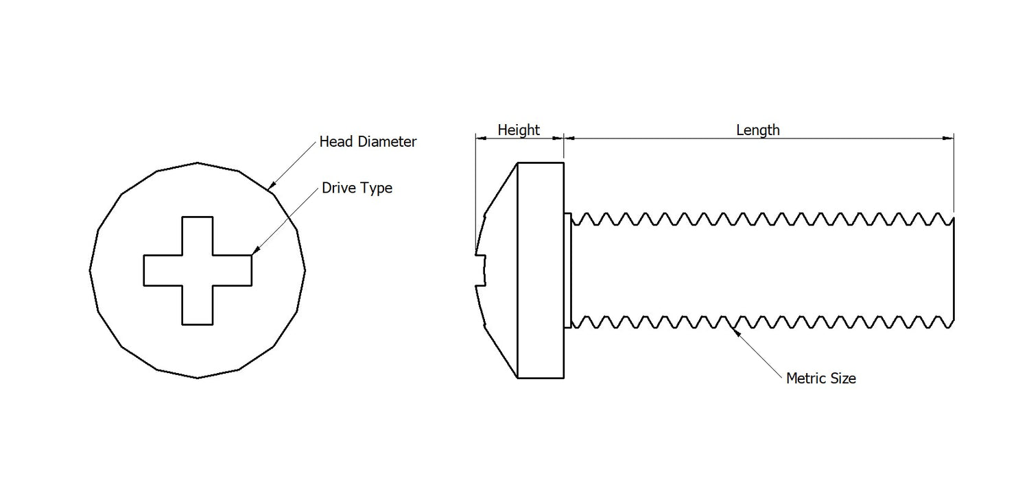 Dimensions for Polycarbonate Pan Head Screws - Cross Recessed Phillips - DIN 7985 in all available sizes are shown according to the product drawing above.