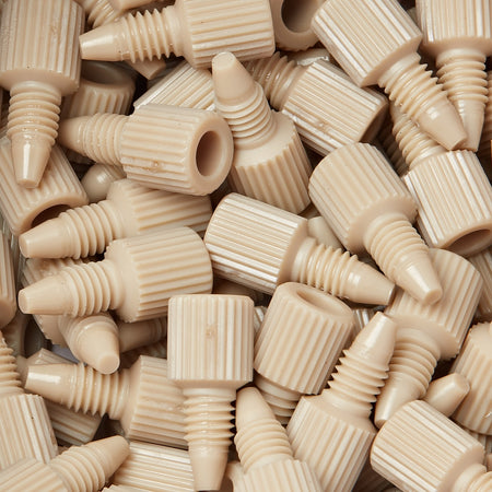 Los tapones HPLC (cromatografía líquida de alto rendimiento) fabricados en PEEK (polieteretercetona) ofrecen un rendimiento y una fiabilidad excepcionales en los sistemas cromatográficos. Estos tapones especializados están diseñados para sellar de forma segura los extremos de las columnas de HPLC, garantizando conexiones sin fugas y manteniendo un rendimiento óptimo del sistema. El PEEK, un termoplástico de alto rendimiento, presenta una excelente resistencia química, estabilidad a altas temperaturas y bajos extractables, lo que lo hace ideal para aplicaciones de HPLC. Los tapones finales de PEEK proporcionan un sellado hermético y duradero que evita la contaminación de la muestra y garantiza resultados precisos y reproducibles. Gracias a sus propiedades mecánicas superiores y a su compatibilidad con una amplia gama de disolventes, los tapones finales para HPLC fabricados en PEEK son la opción preferida de los cromatógrafos que buscan separaciones cromatográficas fiables y eficientes.
