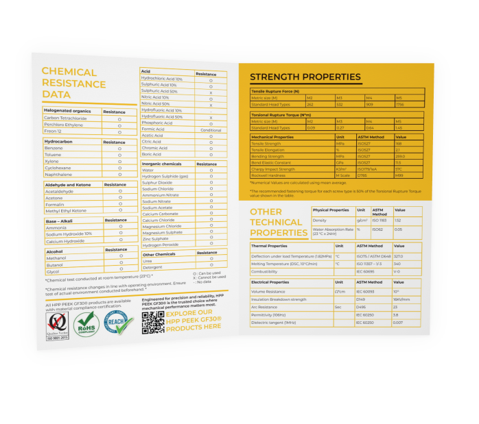 Hoja de datos A4 de alta calidad que presenta las principales características de rendimiento del PEEK GF30 en un formato claro y profesional. Impresa en papel brillante de 250 g/m² para una mayor durabilidad y un tacto de primera calidad, incluye datos técnicos completos que abarcan las propiedades mecánicas, térmicas, eléctricas y químicas.