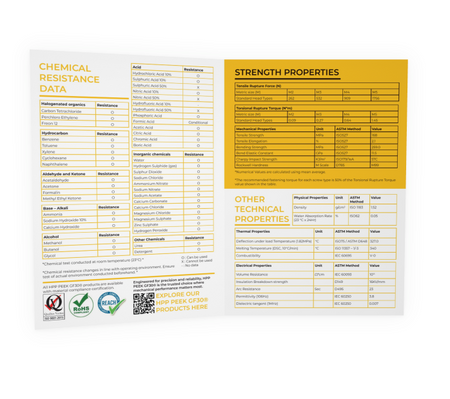Diseñada para una consulta rápida en oficinas, instalaciones de producción y reuniones, esta hoja es una herramienta esencial para especificar las características de PEEK GF30 con confianza.