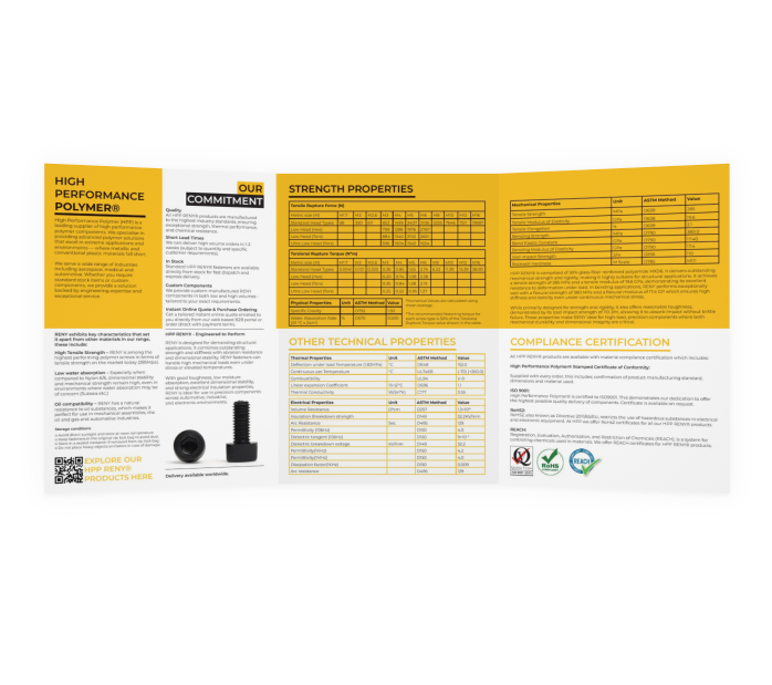 Hoja de datos A4 de alta calidad que presenta las principales características de rendimiento de RENY en un formato claro y profesional. Impresa en papel brillante de 250 g/m² para una mayor durabilidad y un tacto de primera calidad, incluye datos técnicos completos sobre propiedades mecánicas, térmicas, eléctricas y químicas.