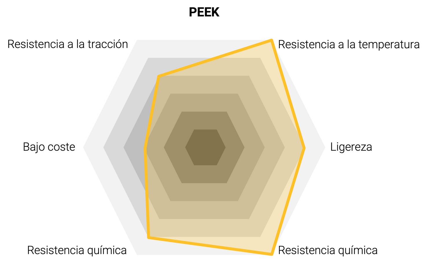 Siga el enlace siguiente para consultar nuestra hoja de datos PEEK . Incluye propiedades como la resistencia mecánica, eléctrica, térmica y química.
