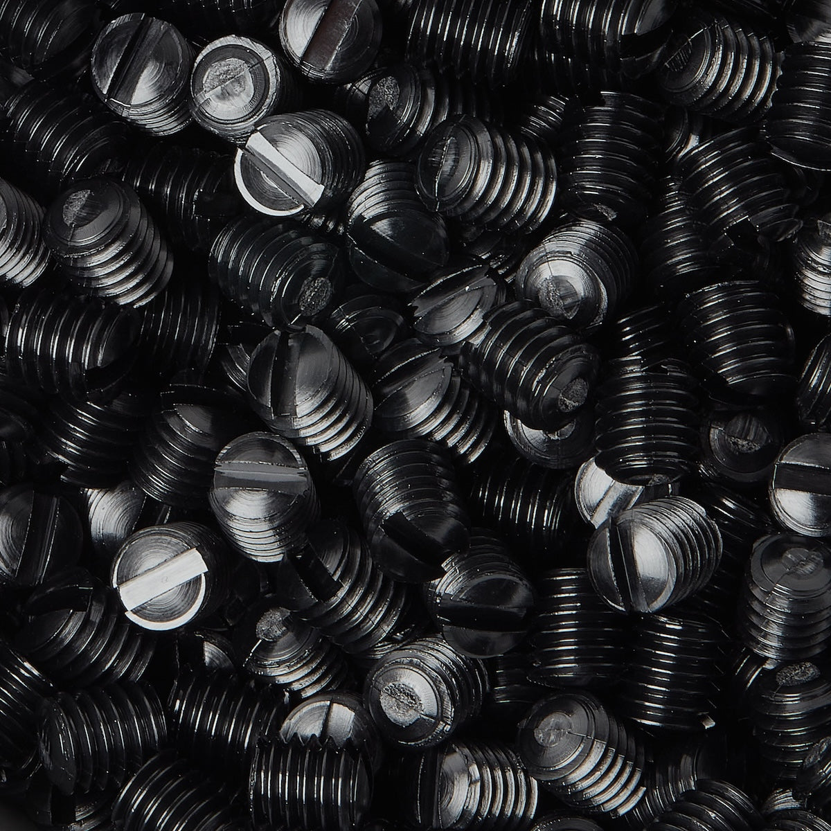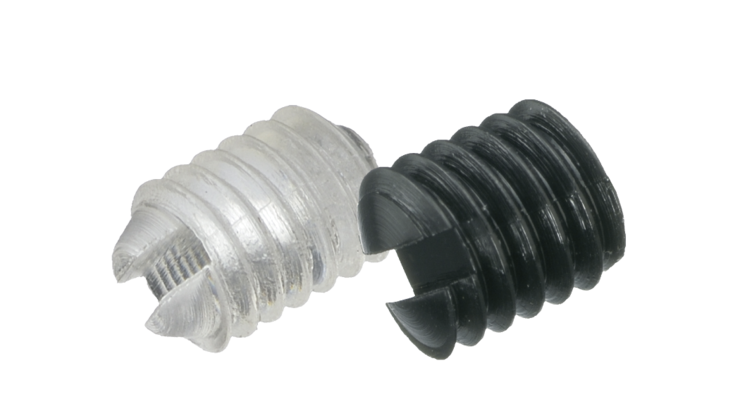 Los "Grub" ranurados de policarbonato (PC), también conocidos como tornillos de ajuste, están disponibles en tamaños métricos M3-M6.
